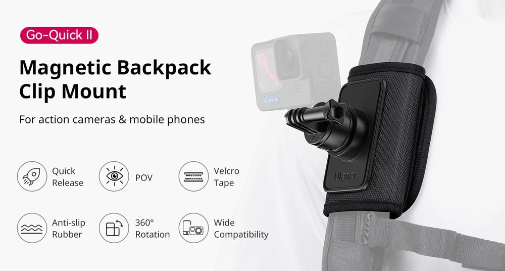 The Ulanzi CO62 Go-Quick II Universal Mount allows you to securely attach your camera or phone to the shoulder strap of your backpack for POV video shooting. The magnetic system allows you to instantly change accessories and angles without taking your eyes off the adventure.