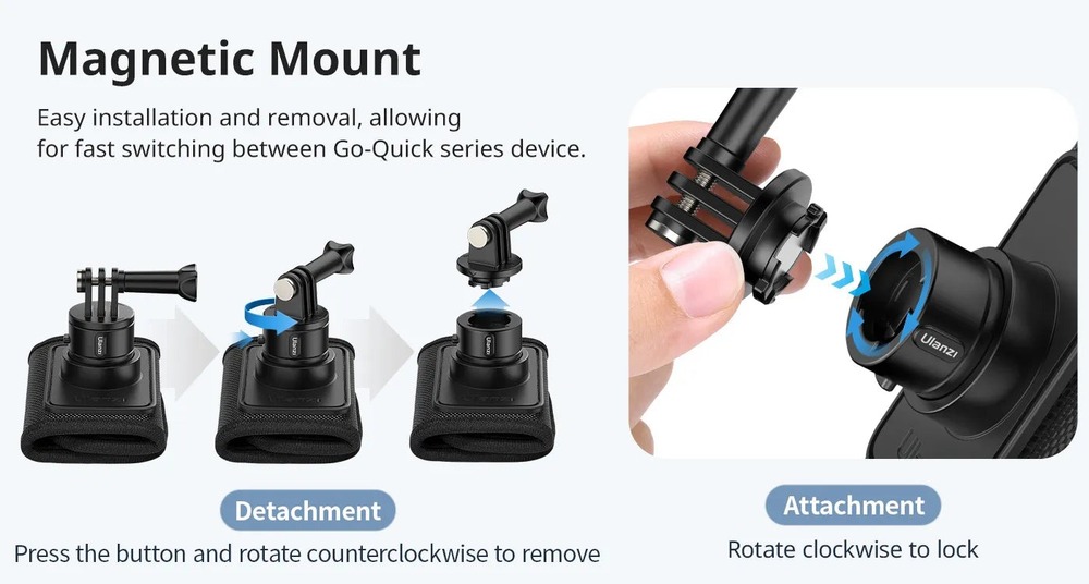 The magnetic system allows you to attach the device with a simple clockwise twist, and to remove it, simply press a button and turn the camera the other way around. This is ideal for those who frequently switch between handheld and POV shooting.