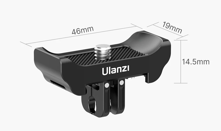 The compact Ulanzi quick-release adapter with magnetic fixation combines three interfaces in one housing: 1/4" thread, GoPro and DJI Action mounts. It allows you to instantly switch between different types of mounts without unscrewing screws, unnecessary adapters, and wasting time on reconfiguring the set.
