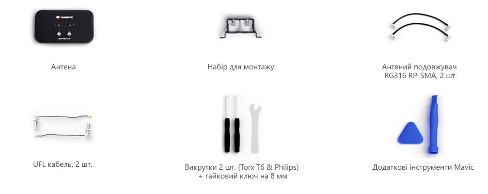 Підсилювач легко та надійно встановлюється на пульті управління дрона. Усі необхідні кріплення та кабелі для установки підсилювача сигналу Raptor SR входять до комплекту.