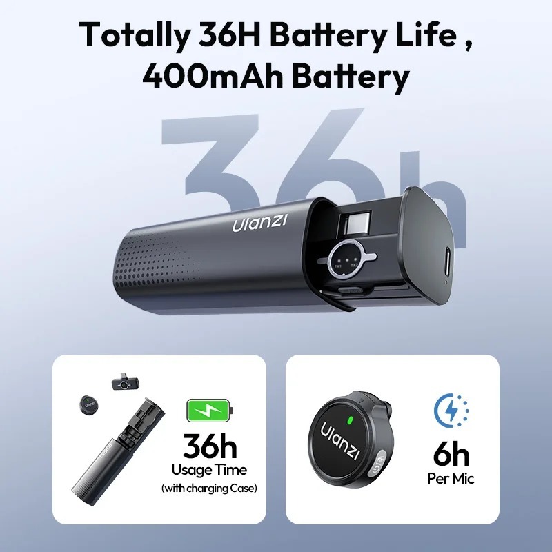 Одного заряда микрофона хватает на 6 часов непрерывной записи, а компактный зарядный кейс увеличивает общее время использования до внушительных 36 часов.