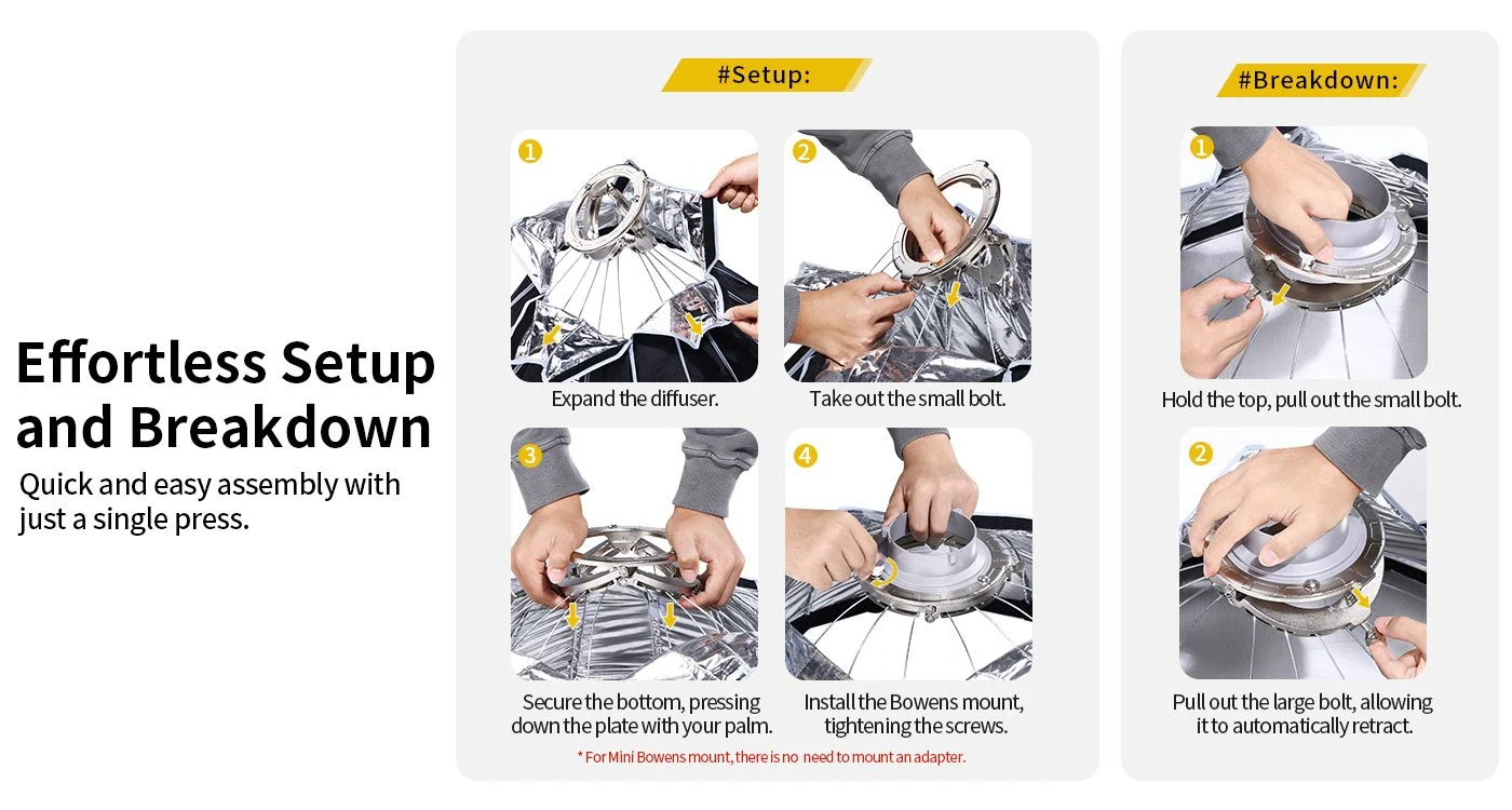 Mini Bowens Mount — совместимость с компактными LED-светильниками и моноблоками, имеющими этот стандарт.