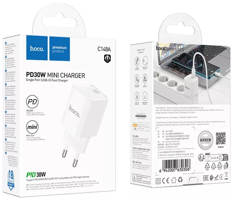 Зарядное устройство HOCO C148A USB-C PD30W White — это компактный и универсальный адаптер, созданный для быстрой и стабильной зарядки современных гаджетов. Он поддерживает протоколы Power Delivery, Quick Charge и PPS, что позволяет заряжать смартфоны, планшеты, наушники, экшн-камеры, геймпады, фитнес-браслеты, смарт-часы и много другой портативной техники. Максимальная мощность 30 Вт и выходной ток 3А обеспечивают действительно быструю зарядку независимо от типа устройства.