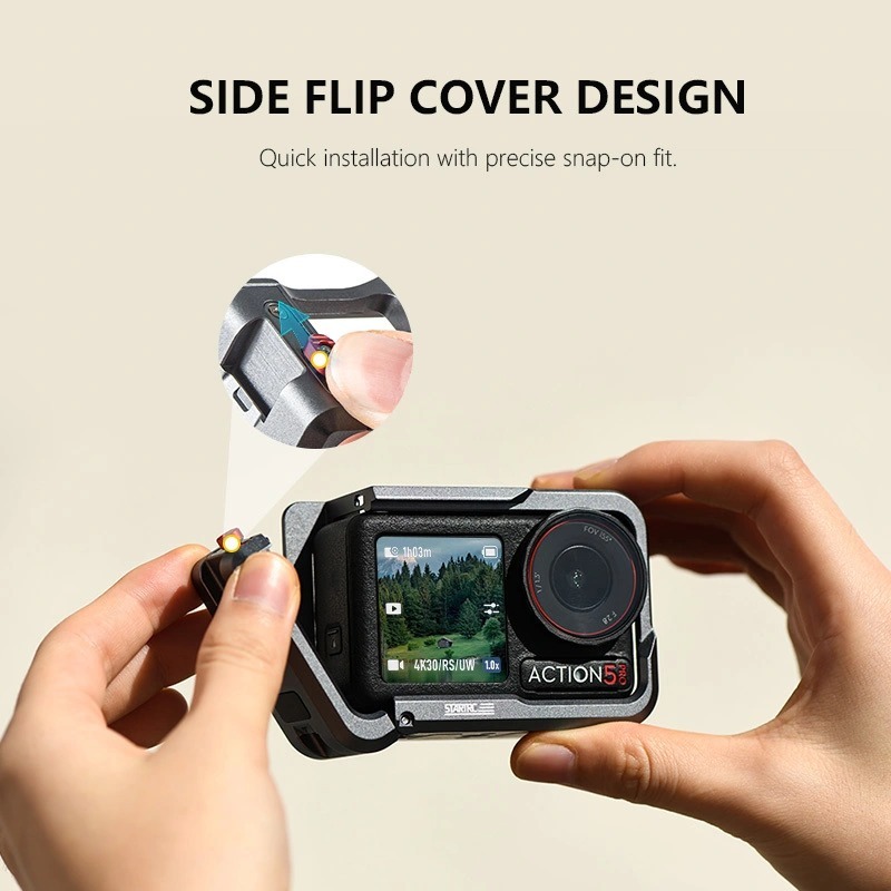 Кейс оснащен удобной откидной боковой крышкой (Side Flip Cover Design). Это позволяет установить камеру за секунду и надежно зафиксировать ее внутри без использования дополнительных инструментов.