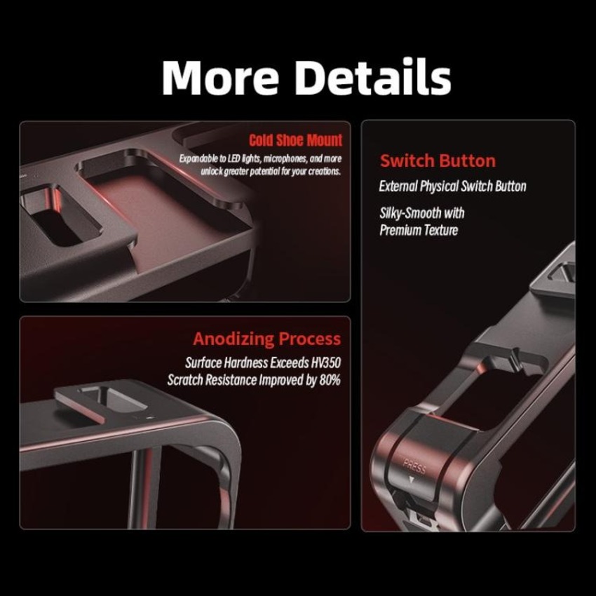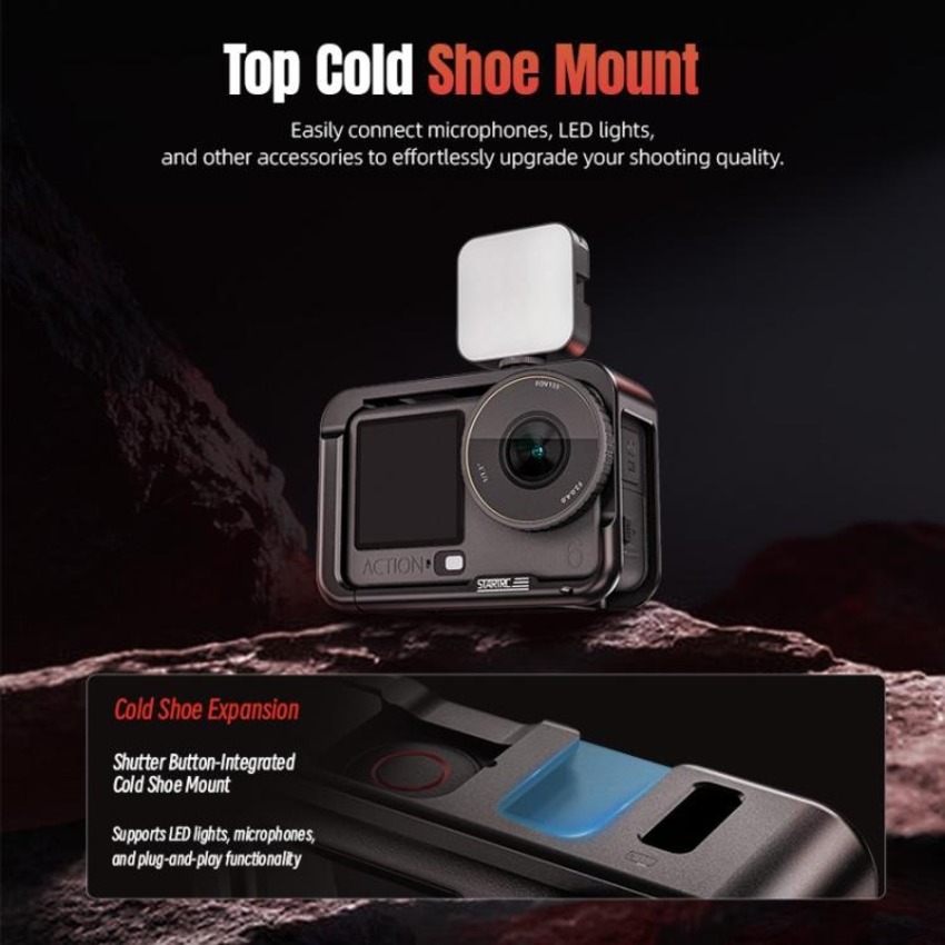 В верхней части клетки предусмотрено крепление Cold Shoe ("холодный башмак") для установки дополнительных аксессуаров, таких как накамерный свет или внешний микрофон. Это позволяет мгновенно превратить экшн-камеру в профессиональный инструмент для влогинга.