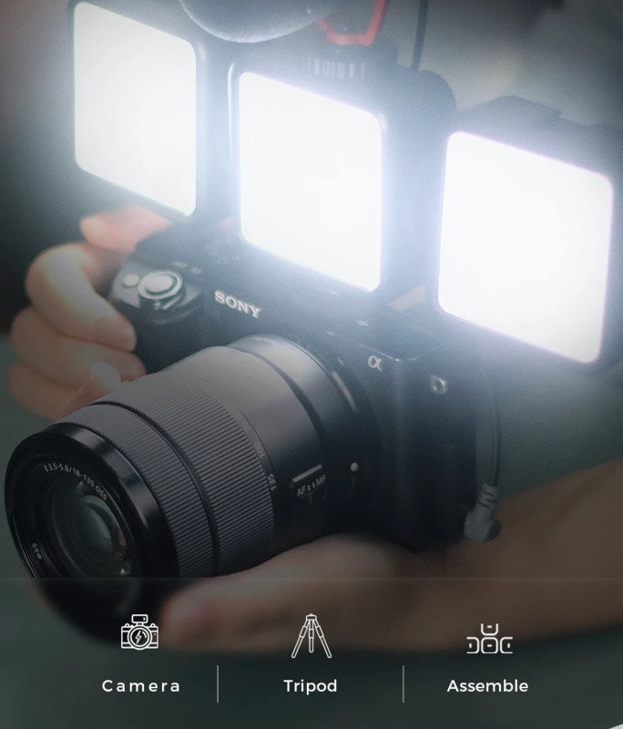 Совместим с камерами, штативами и большинством устройств, оснащённых разъёмом «холодный башмак». Это делает свет максимально универсальным и удобным в использовании как с профессиональной техникой, так и с компактными гаджетами. Особенность модели — наличие трёх креплений, которые позволяют объединять несколько ламп между собой, создавая более мощное и равномерное освещение, что помогает добиться профессионального качества изображения даже в домашних условиях.