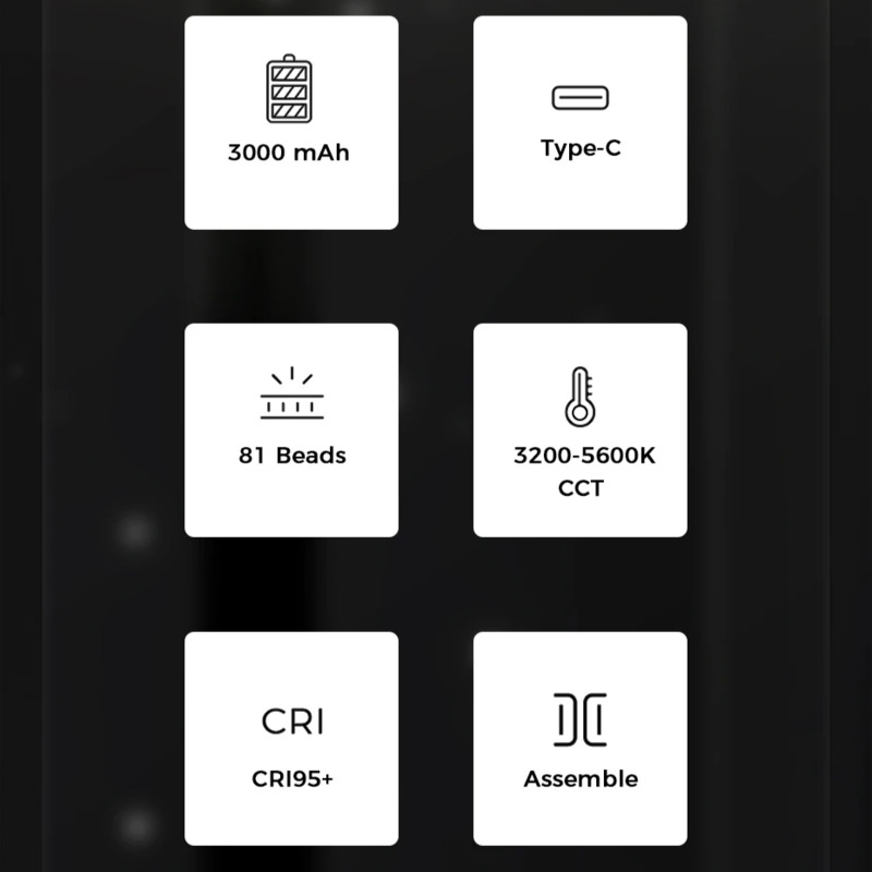 Аккумулятор ёмкостью 3000 мА·ч гарантирует длительную автономность: до 150 минут при максимальной яркости и до 480 минут при минимальной. Это позволяет использовать светильник как в студии, так и на выездных съёмках без постоянной подзарядки.