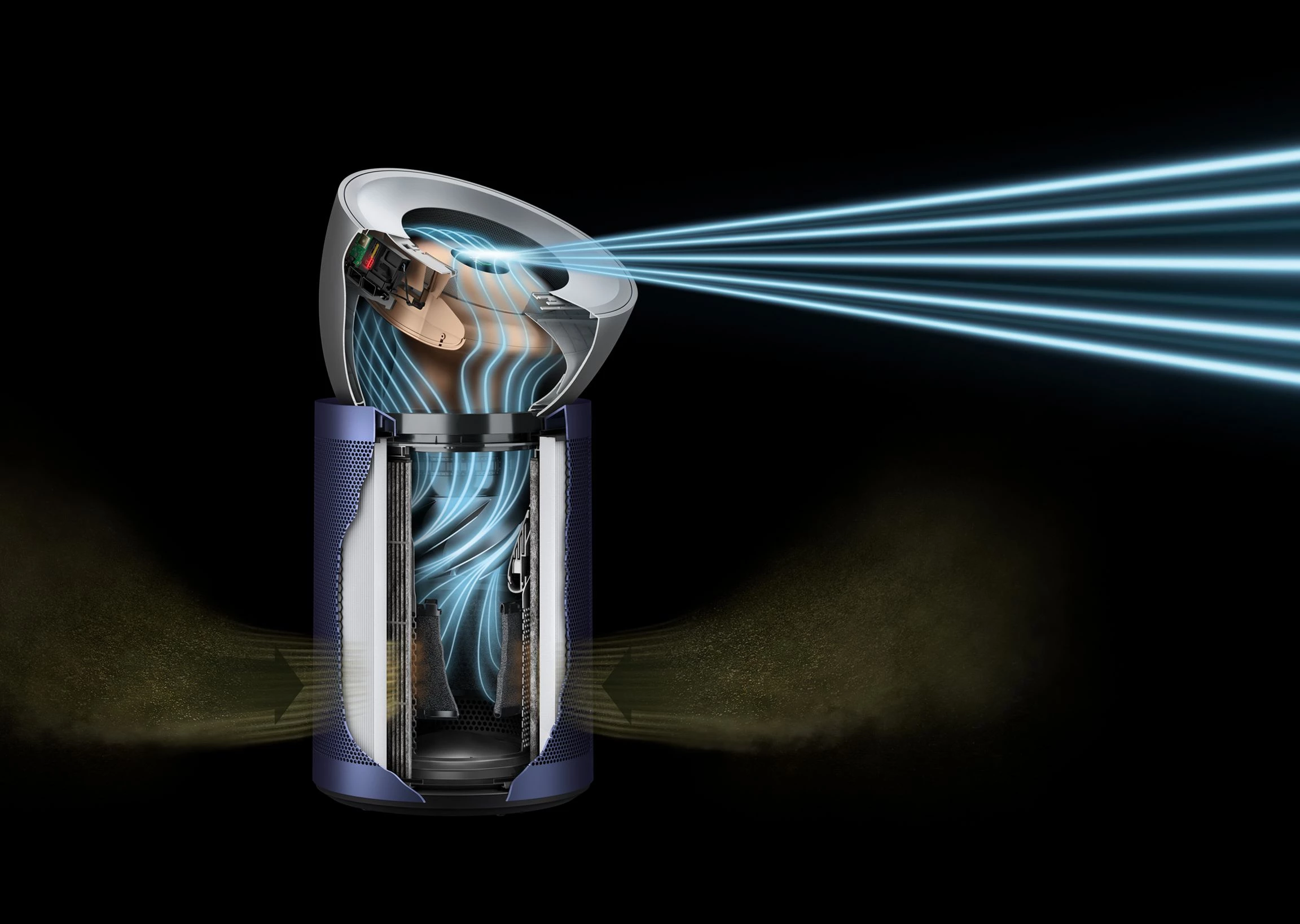 Очиститель воздуха использует уникальную концепцию конусной аэродинамики для создания мощного потока воздуха, который обеспечивает циркуляцию воздуха в помещении и улавливает даже удаленные загрязнители через герметичные фильтры. Это инновационное решение позволяет не только эффективно очищать воздух в непосредственной близости от устройства, но и обеспечивать очистку всего объема воздуха в помещении, включая большие пространства.