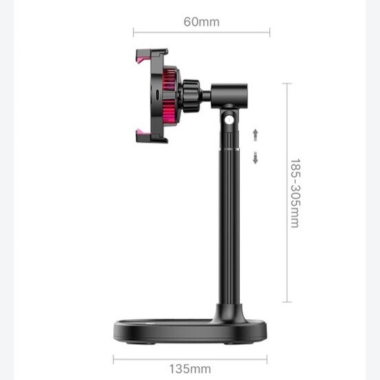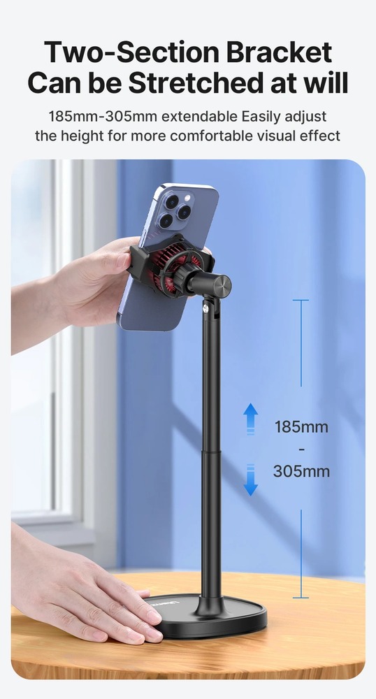 Телескопическая конструкция с диапазоном 185–305 мм позволяет точно настроить положение смартфона под стол, рабочее место или стрим-зону. Удобно для съёмки сидя и стоя, без импровизированных подставок.