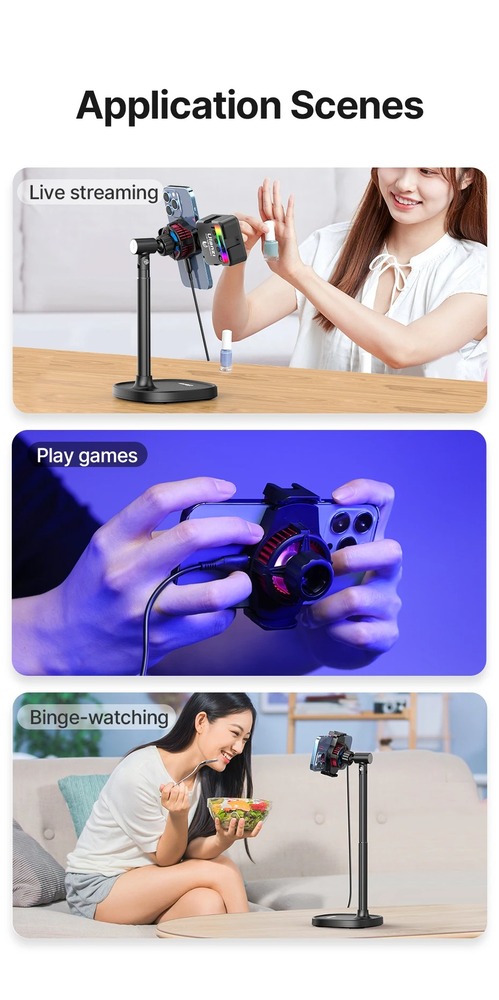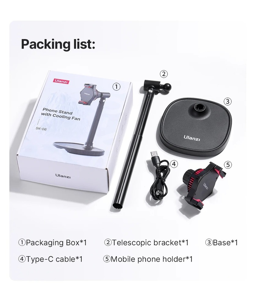 Ulanzi SK-06 — это настольный штатив для стриминга, видеосъёмки и онлайн-работы, оснащённый активным охлаждением смартфона. Конструкция сочетает устойчивую базу, телескопическую стойку и держатель с вентилятором, который снижает нагрев телефона во время длительных трансляций, записи видео или игр. Поддерживает большинство современных смартфонов и питание по Type-C.