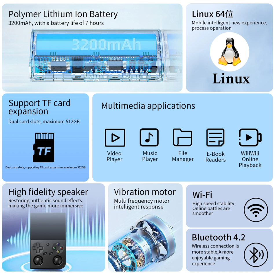 ANBERNIC RG35XX Pro — это компактная ретро-консоль, которая удачно сочетает классический дизайн и современную аппаратную начинку. Устройство работает на базе 64-битной системы Linux, что обеспечивает стабильный запуск десятков классических платформ и портированных игр. Изображение выводится на качественный 3.5-дюймовый IPS-дисплей с отличной цветопередачей и углами обзора, а встроенный вибромотор добавляет геймплею приятной тактильной отдачи.