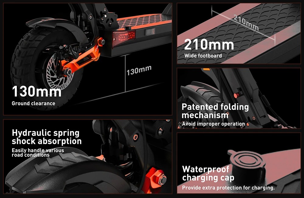 Дорожный просвет в 130 мм позволяет самокату уверенно проезжать над препятствиями, не цепляя декой неровности грунта. Сверхширокая платформа (210 мм) дает возможность удобно поставить ноги рядом, что значительно снижает усталость при долгих заездах и улучшает контроль над устройством на сложных участках пути.