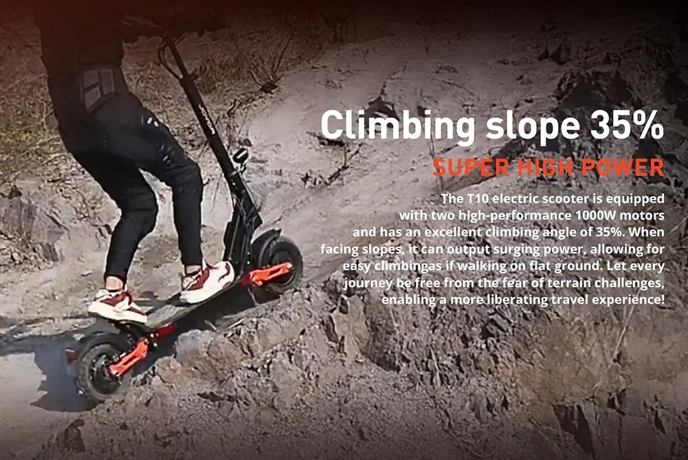 Благодаря мощности двух двигателей, T10 способен преодолевать крутые склоны под углом до 35%. Там, где другие самокаты замедляются или останавливаются, эта модель продолжает уверенно набирать скорость. С таким запасом мощности вы можете забыть о сложностях рельефа и выбирать самые короткие и интересные маршруты.