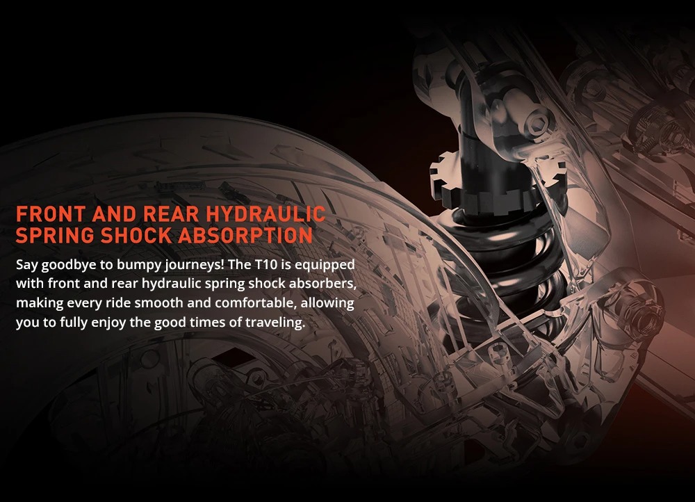 JOYOR T10 оснащен передними и задними гидравлическими пружинными амортизаторами. Система эффективно поглощает энергию ударов от камней, выбоин и стыков плит, делая ход самоката плавным. Вы сможете наслаждаться поездкой, даже если дорога под колесами оставляет желать лучшего.