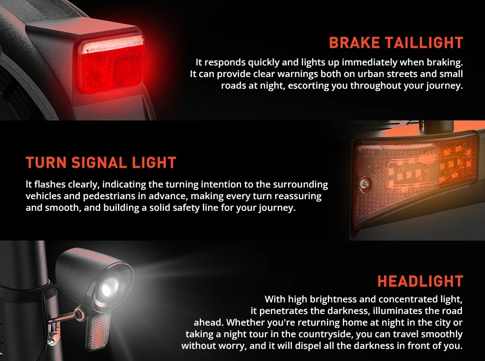 Самокат подготовлен к безопасным ночным поездкам: яркая передняя фара с концентрированным пучком света пробивает темноту на десятки метров вперед. Задний стоп-сигнал мгновенно реагирует на торможение, предупреждая водителей сзади, а встроенные указатели поворота позволяют четко обозначать ваши намерения в транспортном потоке.