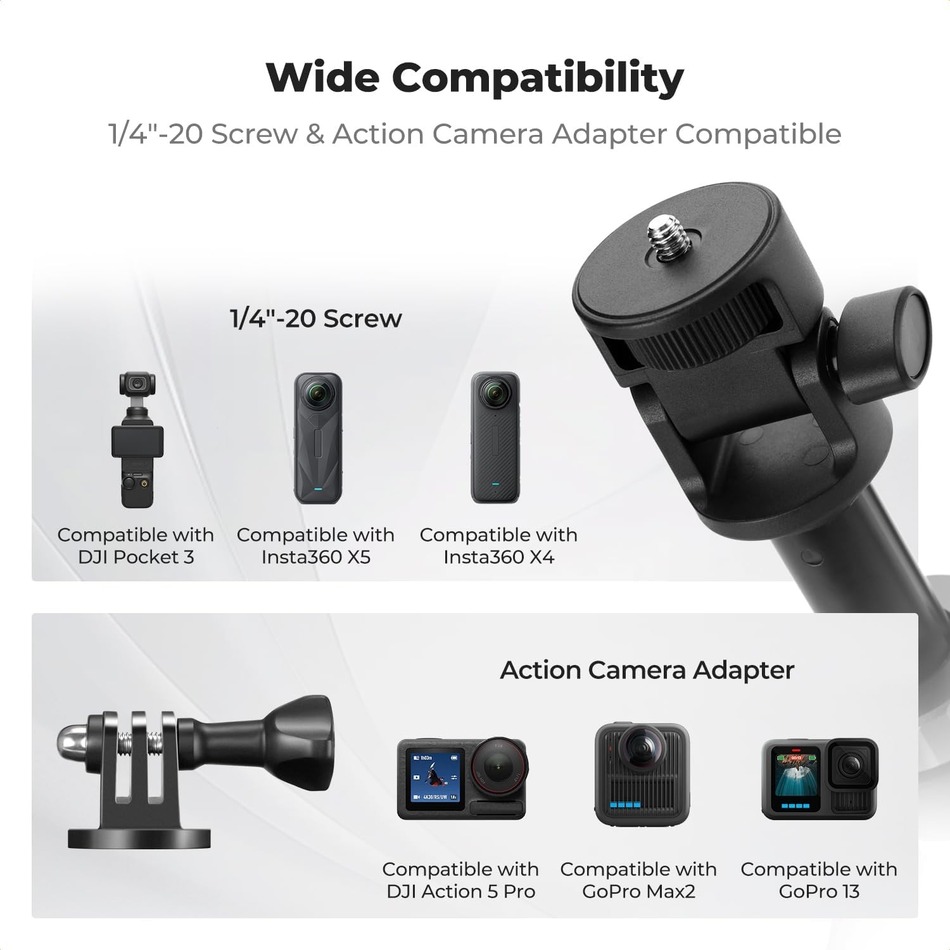 Штатив готов к работе с любой техникой. Стандартный винт 1/4" подходит для камер DJI Pocket 3 или Insta360. Комплектный адаптер позволяет установить экшн-камеры (GoPro, DJI Action). Раздвижной зажим вмещает смартфоны шириной до 8.5 см.