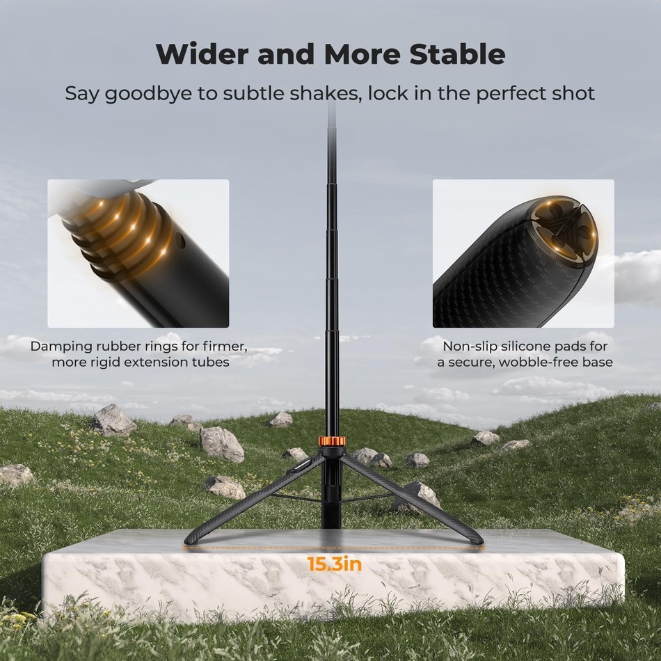 Устройство трансформируется из компактной рукоятки длиной 33 см в полноценный штатив высотой почти в человеческий рост (175 см). Ключевой особенностью является усиленное основание трипода для повышенной устойчивости и универсальная голова, поддерживающая как телефоны, так и камеры.