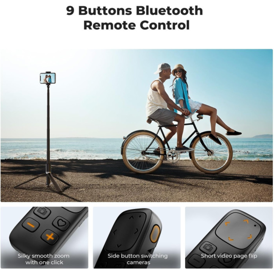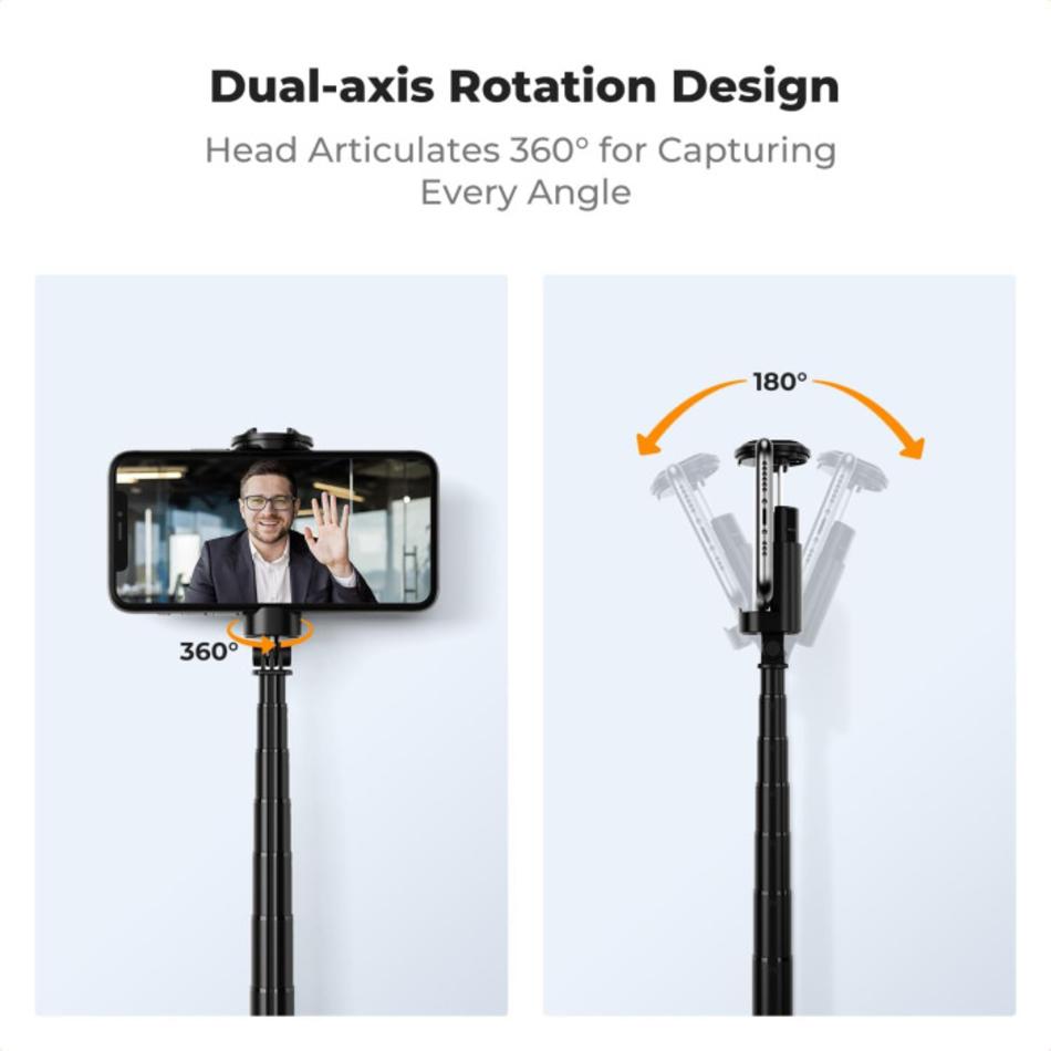Поворотная головка обеспечивает полную творческую свободу, позволяя вращать смартфон на 360° по горизонтали и на 180° по вертикали для поиска идеального ракурса в любой ситуации. Управление процессом становится максимально комфортным благодаря съемному Bluetooth-пульту с девятью функциональными кнопками, а надежная телескопическая система позволяет мгновенно настроить необходимую высоту съемки.