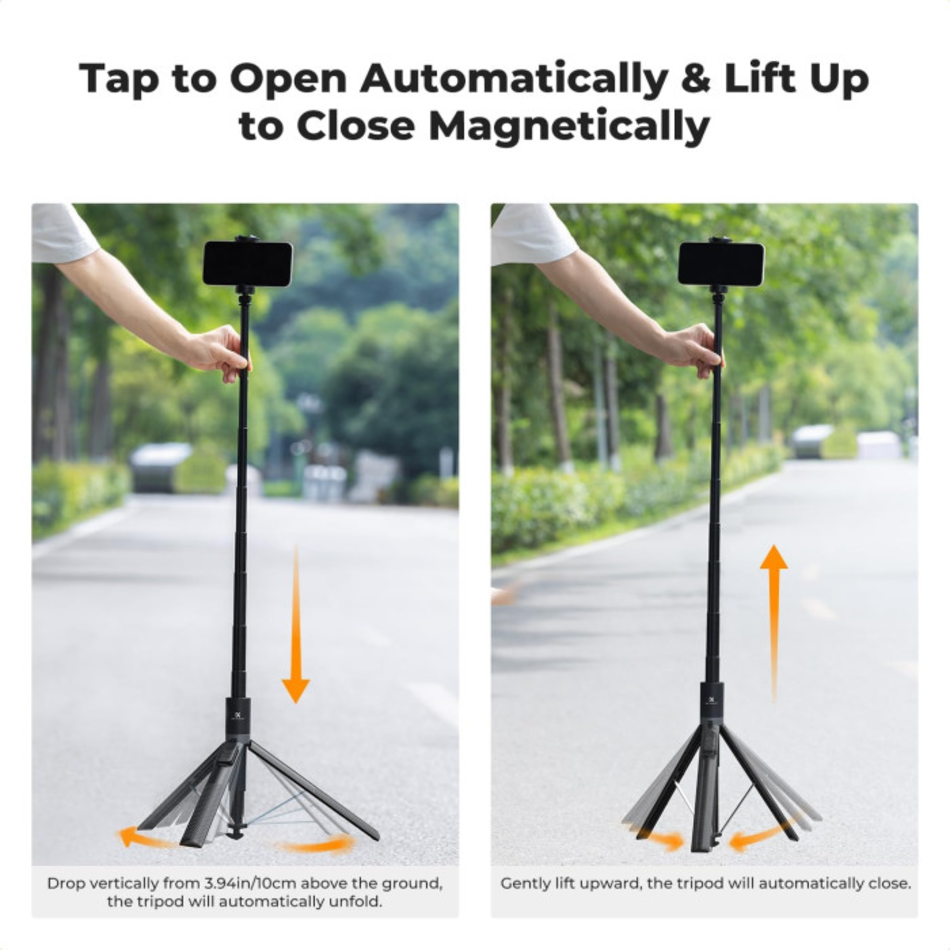 Универсальный штатив-монопод для смартфона с автоматическим раскрытием ножек, Bluetooth-пультом и поворотной головкой 360°. Подходит для фото, видео, стримов и путешествий. Компактный, легкий и реально удобный в повседневном использовании. Благодаря уникальной конструкции 2-в-1 устройство легко трансформируется из компактной селфи-палки в устойчивый напольный штатив, причем ножки основания раскрываются и закрываются автоматически.
