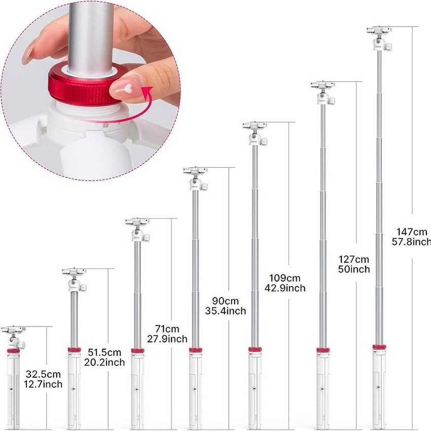 Штатив оснащён 6 секциями регулировки высоты, благодаря чему легко подстроить съёмку под любую задачу — от настольного формата до полноценной напольной установки. Диапазон высоты от 32,5 см до 147 см позволяет точно выставить ракурс для видео, фото, стримов, обзоров и съёмки с разных уровней без дополнительных аксессуаров.