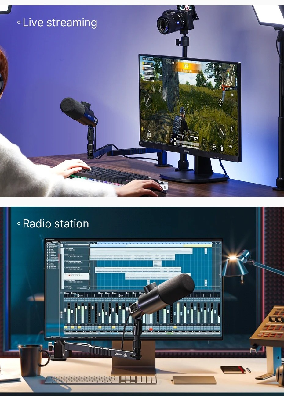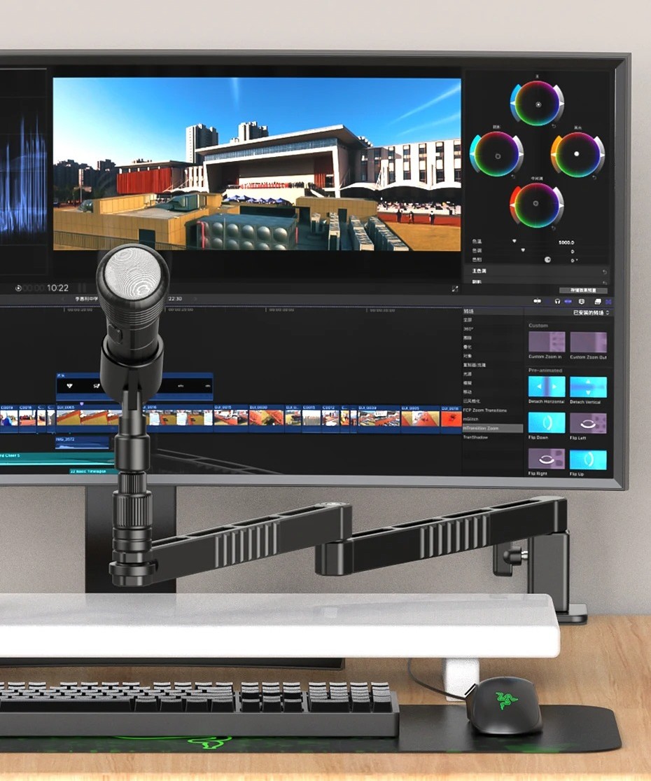 Главная особенность LS26 — возможность "проходить" под мониторами. Это решает вечную проблему стримеров, когда стойка микрофона перекрывает часть изображения на экране или мешает зрительному контакту с камерой.