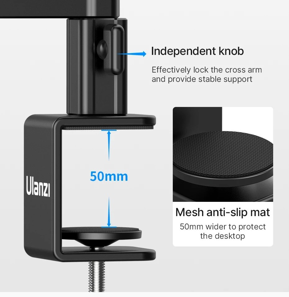 Ulanzi Vijim LS26 — это профессиональная низкопрофильная стойка для микрофона, разработанная для тех, кто ценит свободный обзор и эргономику. В отличие от классических пантографов, эта модель располагается близко к поверхности стола (на высоте около 9.5 см), что позволяет разместить её под монитором, не перекрывая экран. Конструкция выполнена из прочного алюминиевого сплава и способна удерживать тяжелые студийные микрофоны весом до 2 кг.