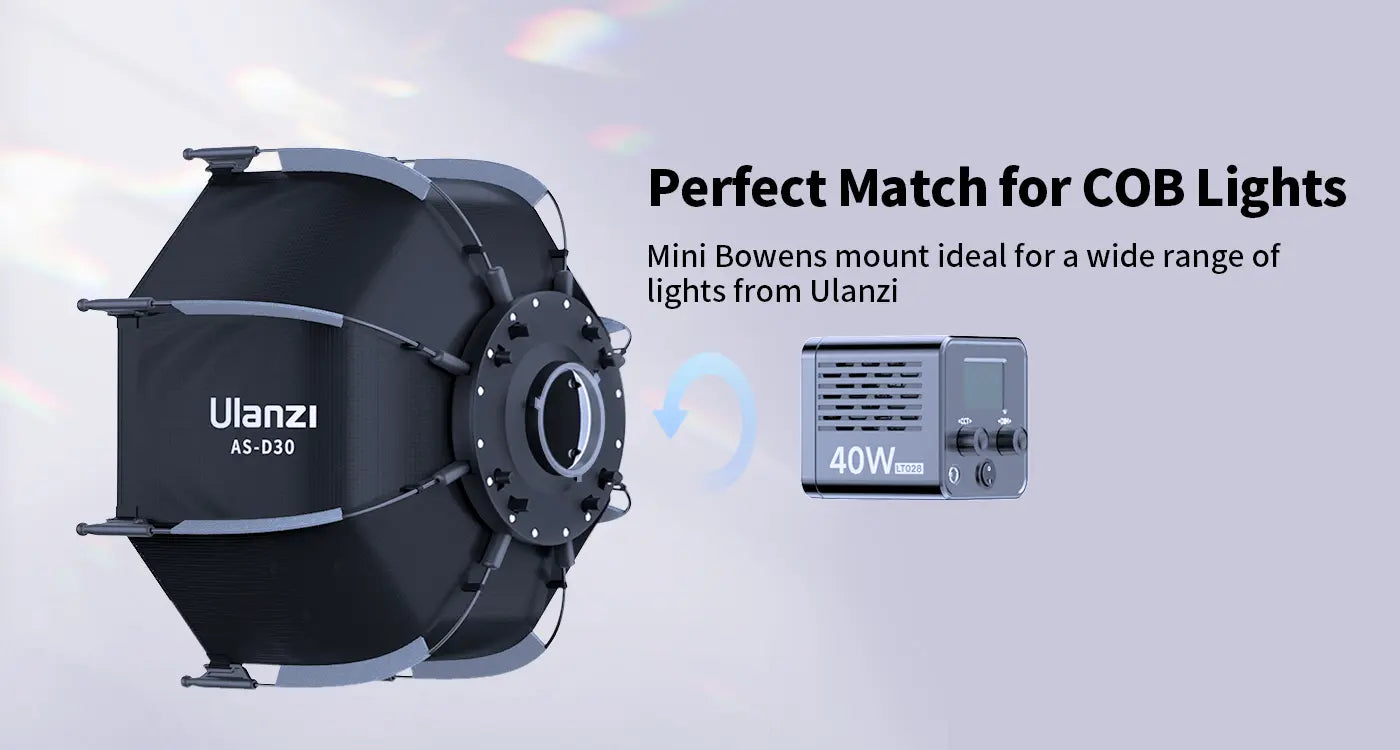 Подходит для большого количества световых приборов от Ulanzi и других производителей с Mini Bowens креплением.
