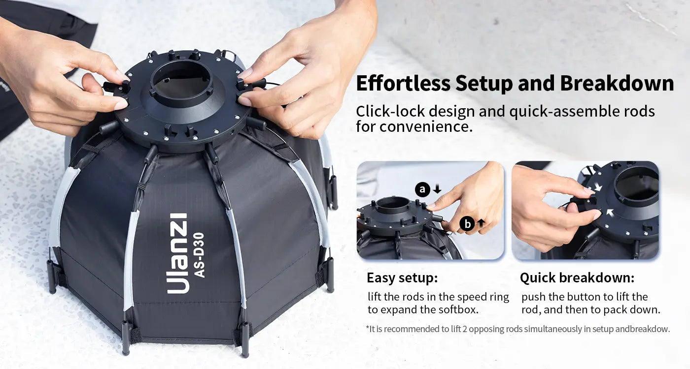 Система click-lock и прочные стержни позволяют собирать или разбирать софтбокс всего за несколько секунд, экономя время и усилия при подготовке к съемке. Такая конструкция делает процесс установки максимально удобным: софтбокс легко фиксируется, надежно держит форму и так же быстро складывается для транспортировки.