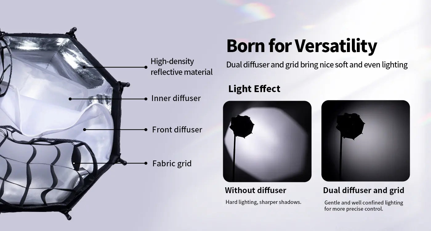Двойной диффузор обеспечивает равномерное рассеивание света, устраняя жесткие тени, а тканевые соты помогают контролировать направление потока, создавая более акцентированное освещение и художественный эффект. Внутренний слой выполнен из высокоплотного отражающего материала, который усиливает световой поток и повышает эффективность работы источника.