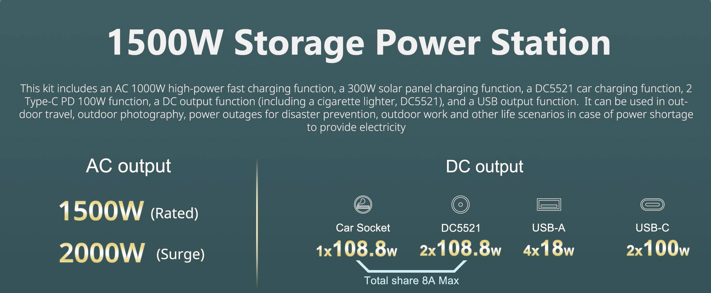 DC5.5 (12В/8Aх2): Два порта DC с выходным напряжением 12 В и током до 8 А подходят для питания автомобильных приборов, таких как холодильники, компрессоры или освещение. Эти порты идеально подходят для использования в автодомах или на пикниках, где требуется постоянное питание для оборудования, предназначенного для работы от автомобильных разъемов.
