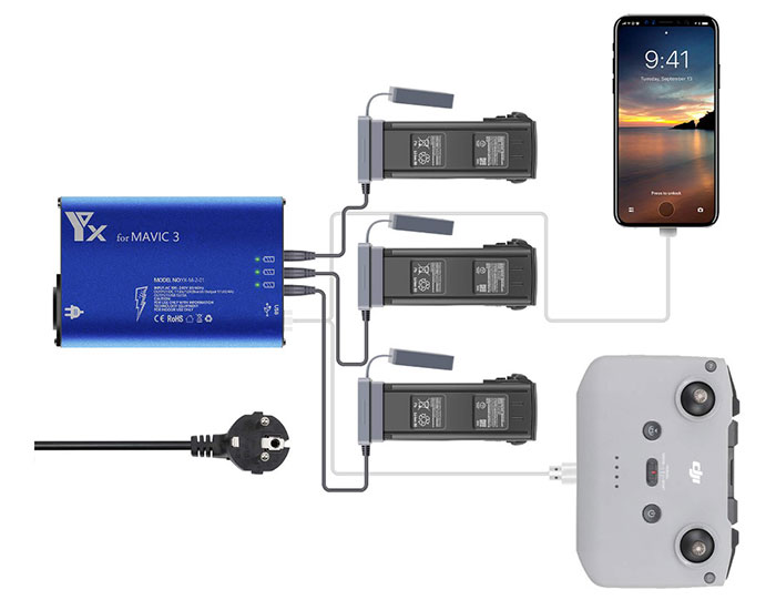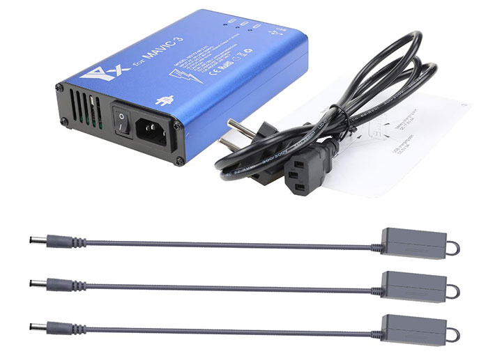 Данное портативное зарядное устройство заряжает 3 батареи Mavic 3 одновременно. Время полной зарядки трёх батарей 90 минут. Также есть два USB порта для зарядки телефона и пульта квадрокоптера.