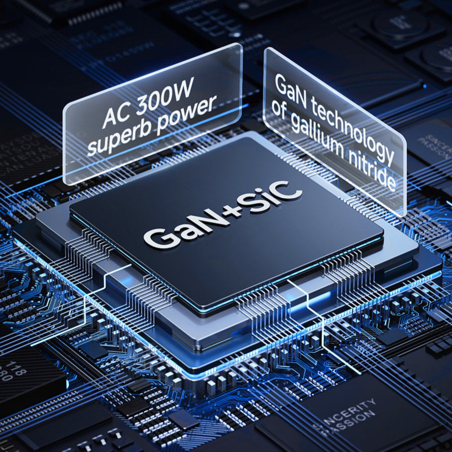 Использование GaN+SiC, двух полупроводниковых материалов третьего поколения, позволяет зарядному устройству, даже при значительно меньшем размере, достичь сверхвысокой мощности переменного тока 300 Вт.