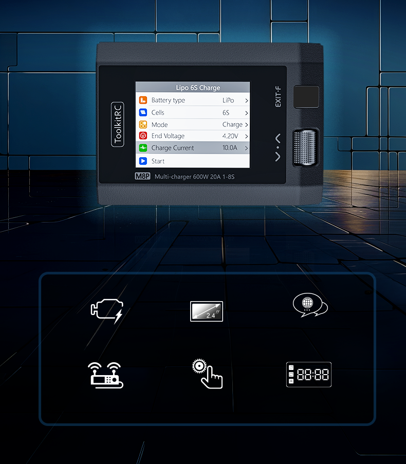 ToolkitRC M8P представляет собой новейшее достижение в области многофункциональных зарядных устройств, которое выделяется своей универсальностью, производительностью и интуитивно понятным интерфейсом. Разработанное с учетом потребностей как профессионалов, так и энтузиастов радиоуправляемых моделей и квадрокоптеров, это устройство сочетает в себе передовые технологии и пользовательский комфорт. Оснащенное мощным функционалом, M8P способно удовлетворить самые разнообразные требования к зарядке и тестированию аккумуляторов, делая его идеальным выбором для тех, кто ищет надежное и эффективное решение для управления питанием своих устройств.