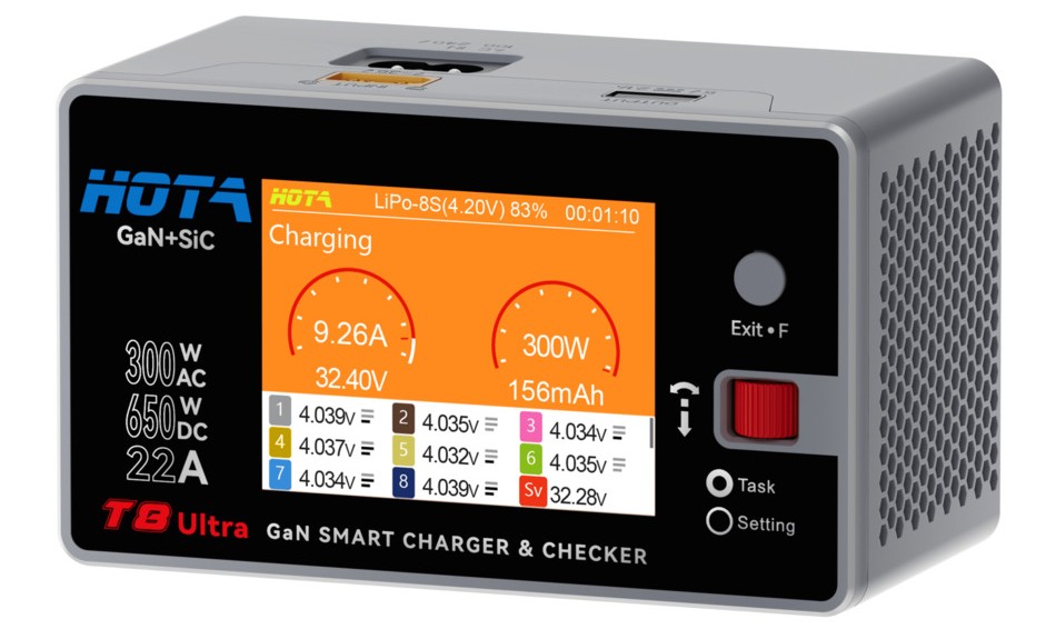 HOTA T8 Ultra — компактное GaN-зарядное устройство с поддержкой до 8S LiPo/LiIon/LiHV-аккумуляторов и мощностью до 650 Вт по DC. Оснащено современными материалами GaN+SiC, что повышает эффективность, снижает нагрев и увеличивает срок службы. Устройство сочетает высокую точность балансировки, мощный кулер с умным контролем температуры и простой интерфейс. HOTA T8 Ultra — это умное зарядное устройство нового поколения, разработанное для пилотов FPV, энтузиастов радиоуправляемых моделей (RC) и пользователей промышленных аккумуляторов.