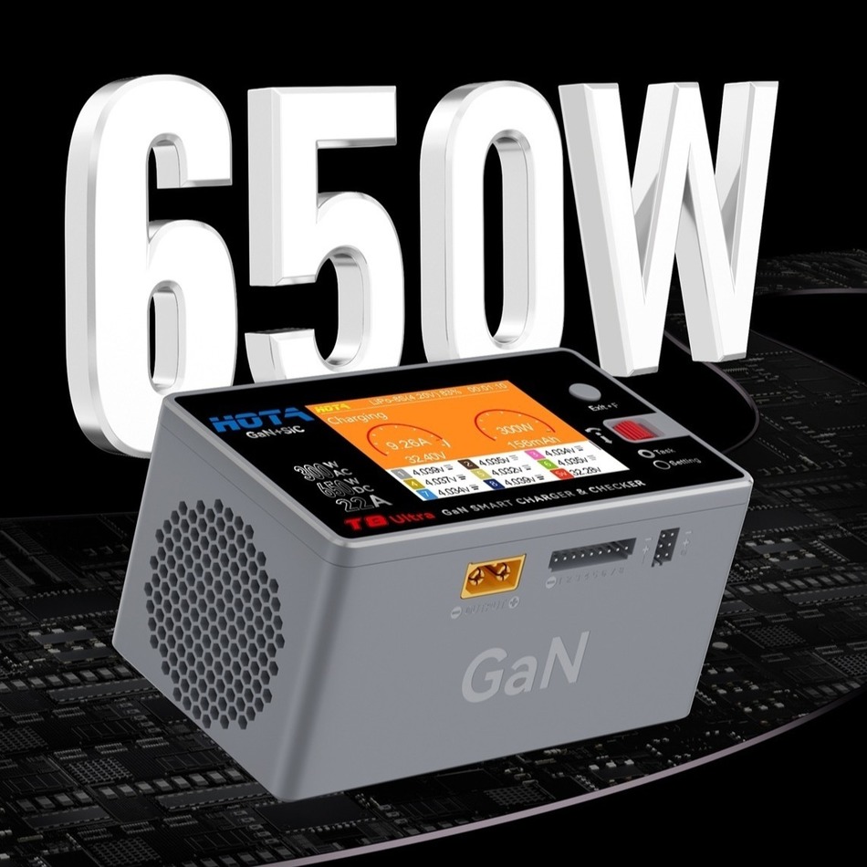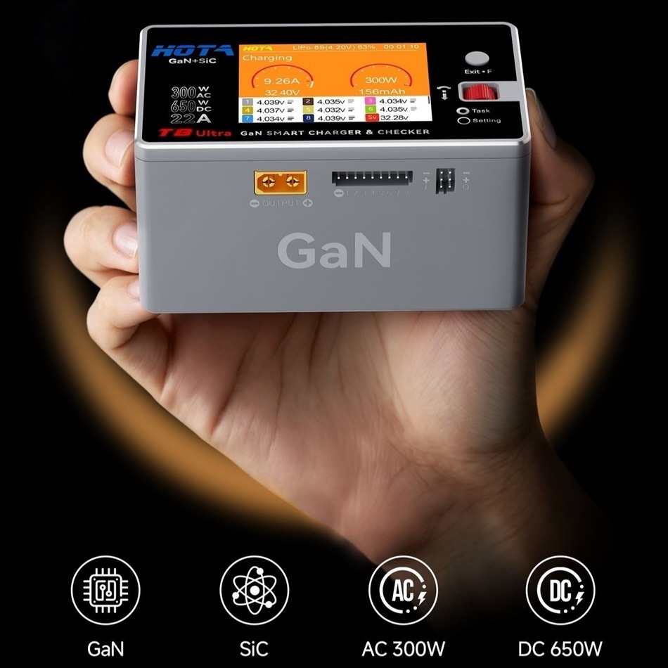 HOTA T8 Ultra — это мощное и при этом компактное устройство для быстрой и безопасной зарядки современных LiPo-аккумуляторов. Благодаря технологии GaN + SiC зарядка работает эффективнее, меньше нагревается и сохраняет стабильность даже под высокой нагрузкой.